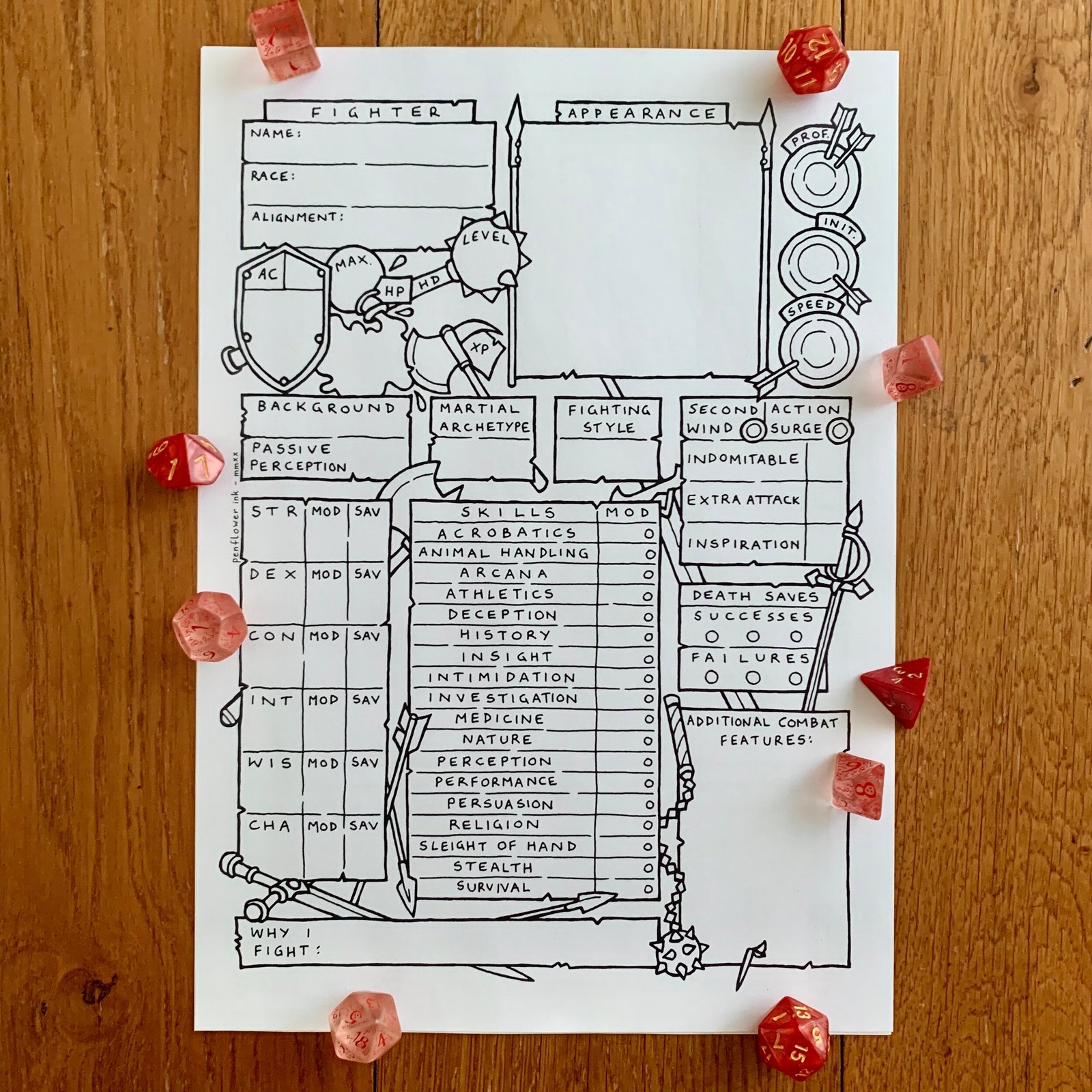 Please note that the 5E Fighter Character Sheet is a digital product only. There are no shipping costs, and you will not receive a physical product. After completing your purchase, you will receive a download link for your chosen product. You will get 3 download attempts, so make sure you store your file somewhere safe.