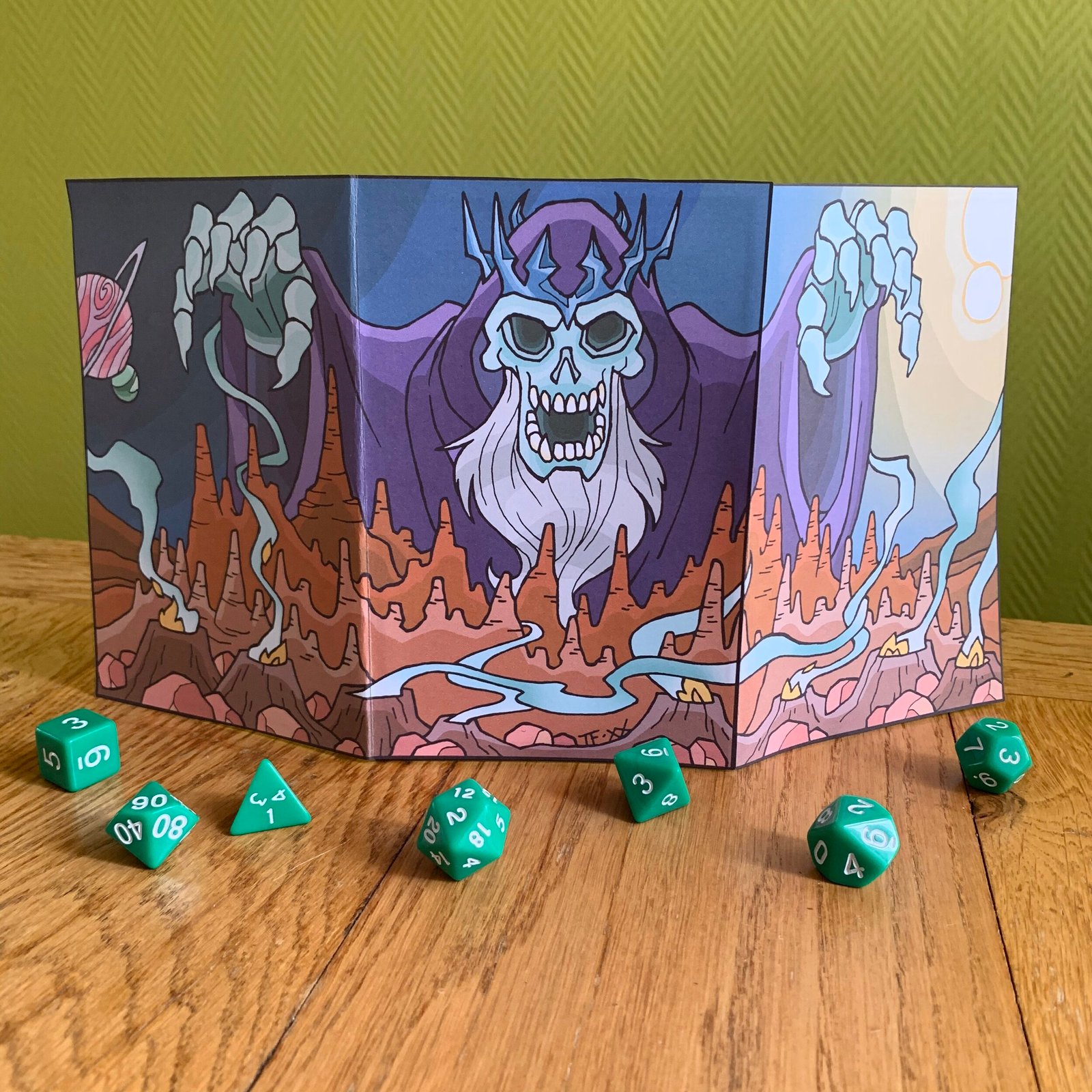 A printable, portable and easy to assemble Game Master screen, featuring a fearsome king space wizard!