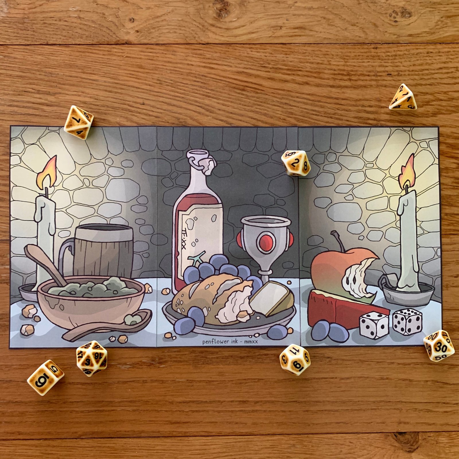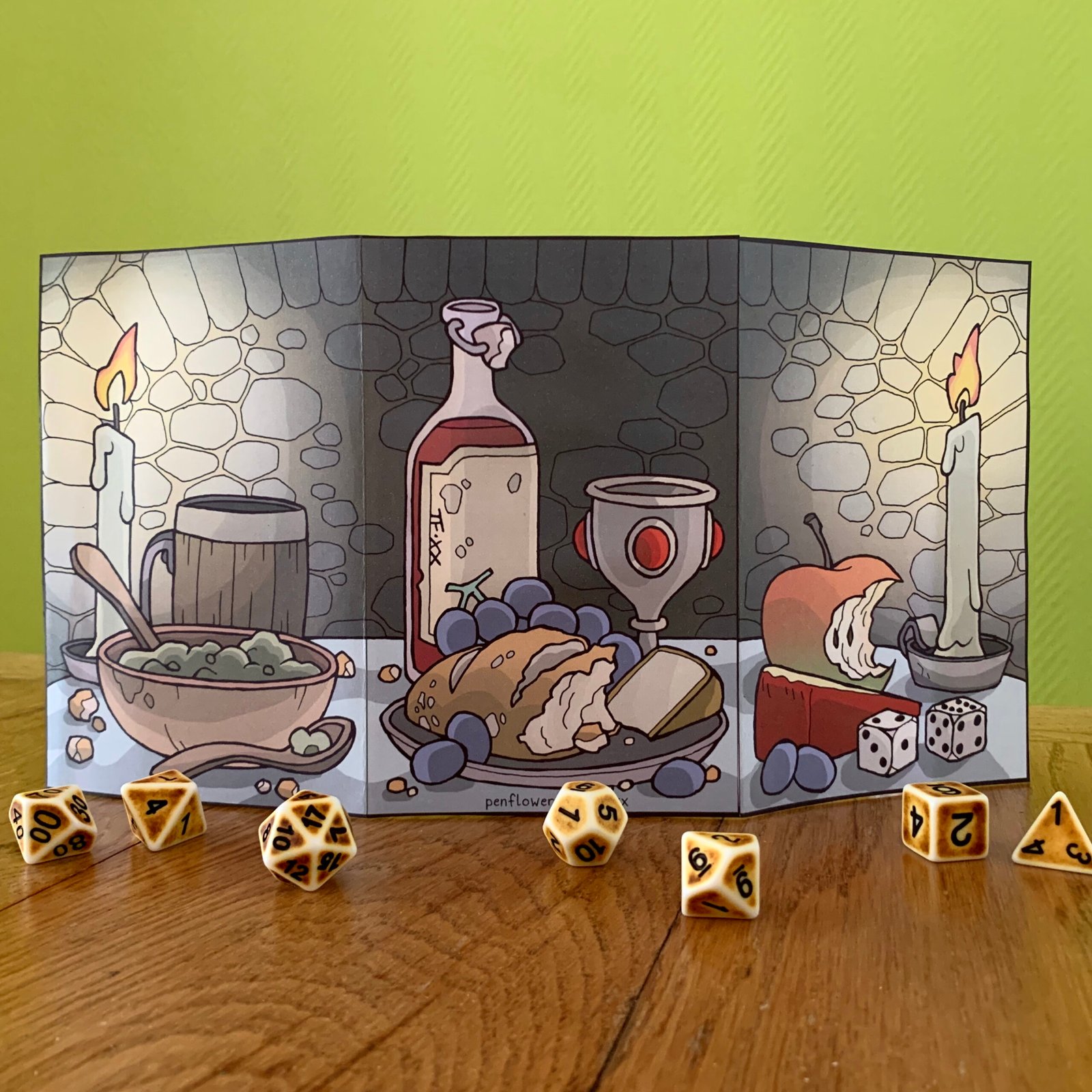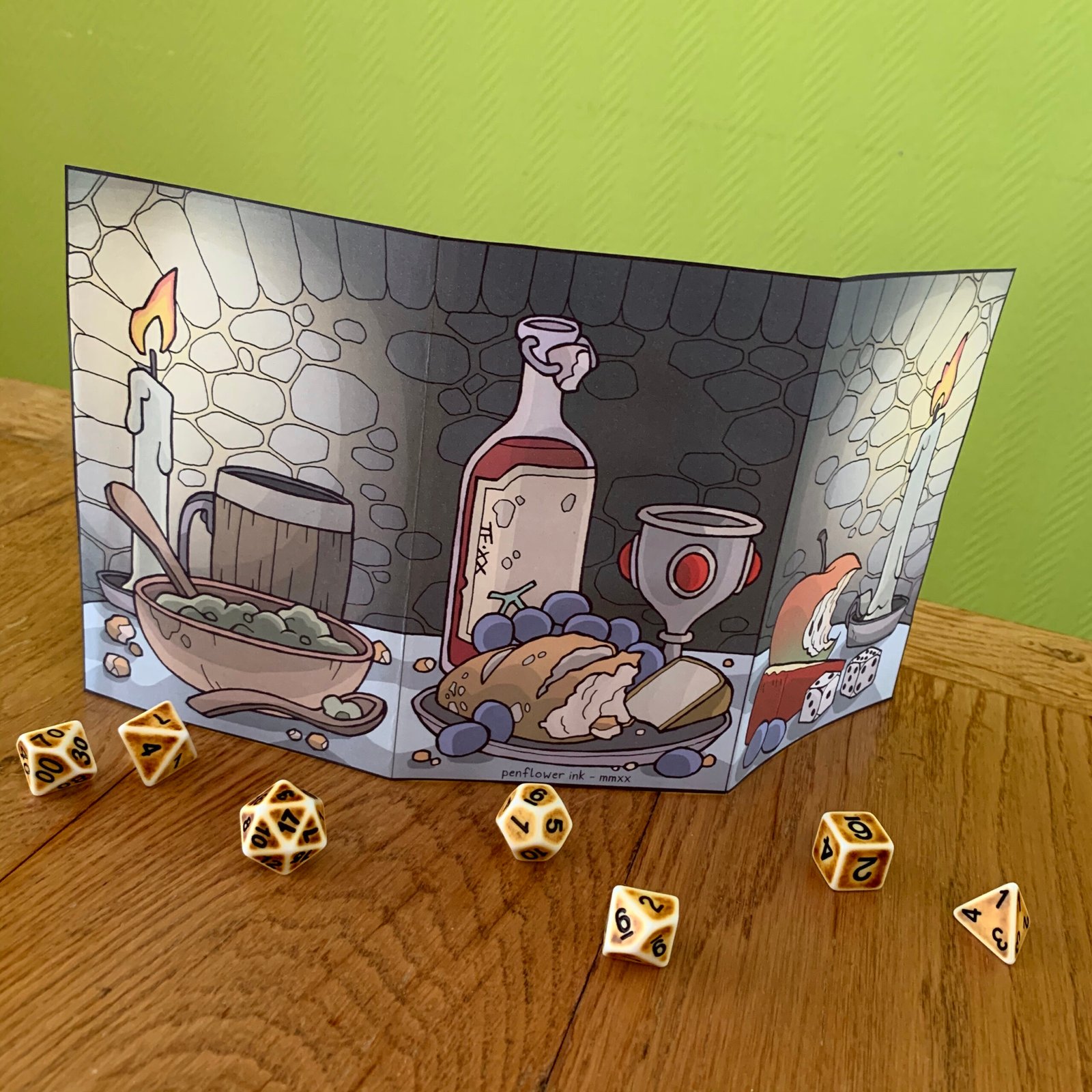 A printable, portable and easy to assemble Game Master screen, featuring a cosy tavern table!